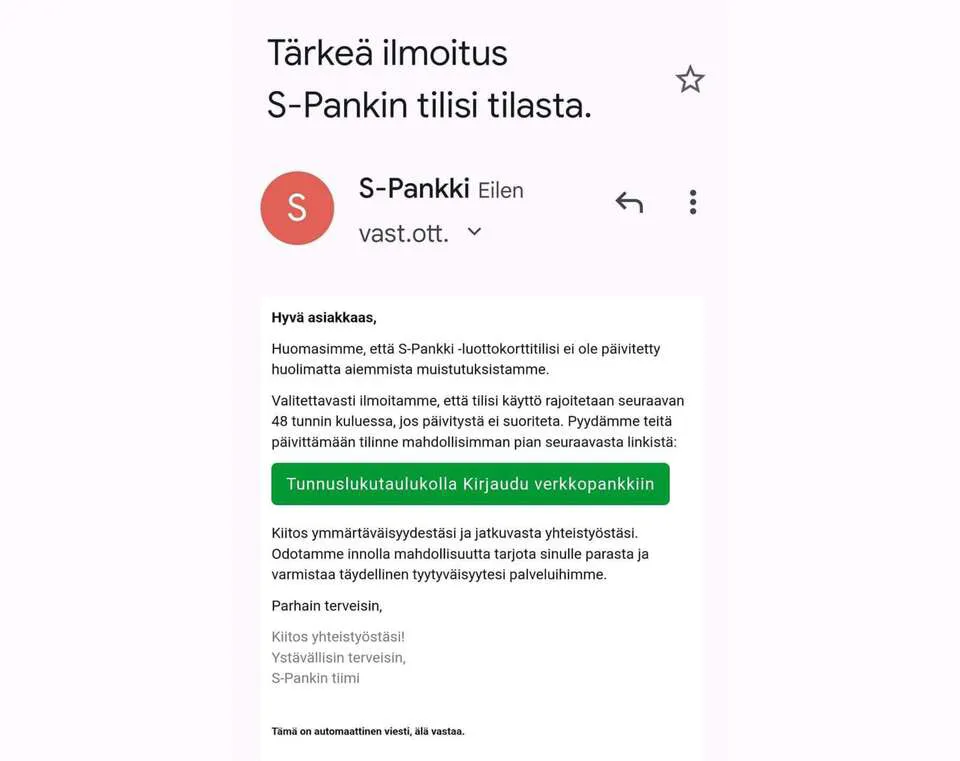 Huijausviestin tunnistamiseksi tarkkaile lähettäjän osoitetta ja viestin kieliasua. Viime aikoina erityisen aktiivisesti on lähetetty huijausviestiä, joka on otsikoitu: ”Tärkeä ilmoitus S-Pankin tilisi tilasta”.
